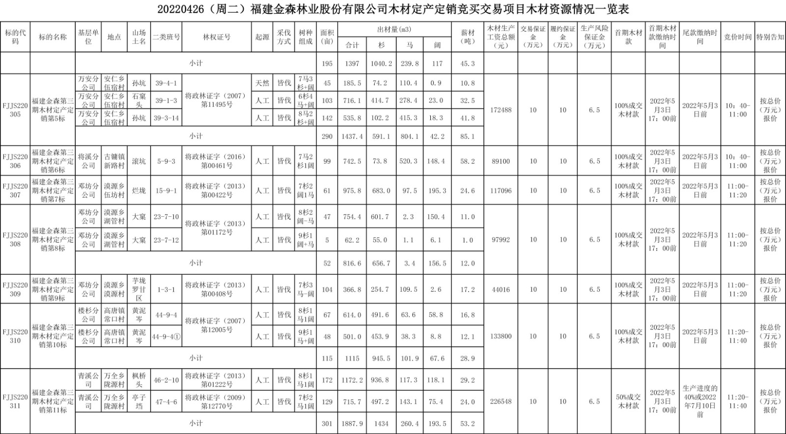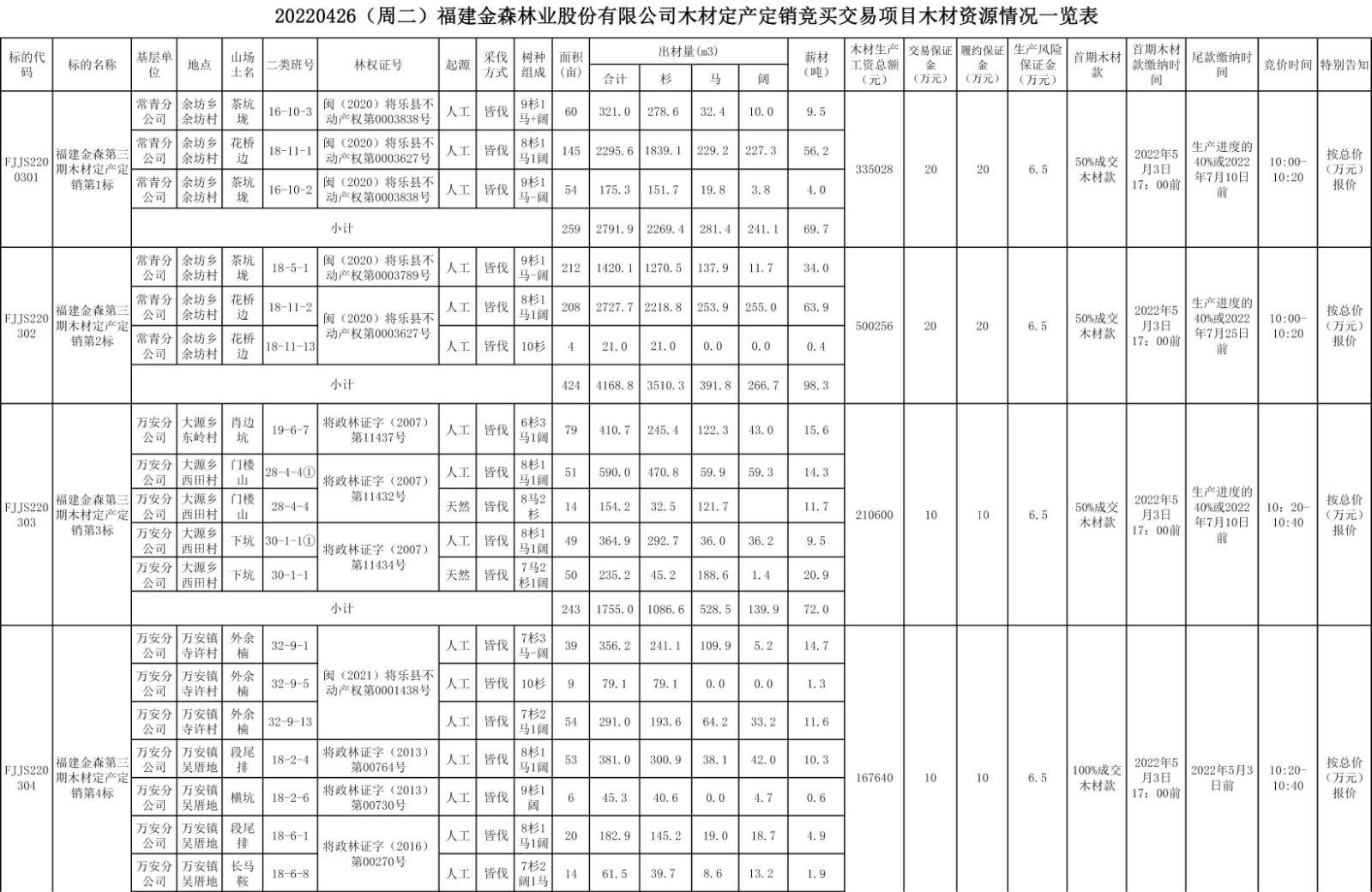 20220426(周二)福建金森林業(yè)股份有限公司木材定產(chǎn)定銷競買交易項(xiàng)目
