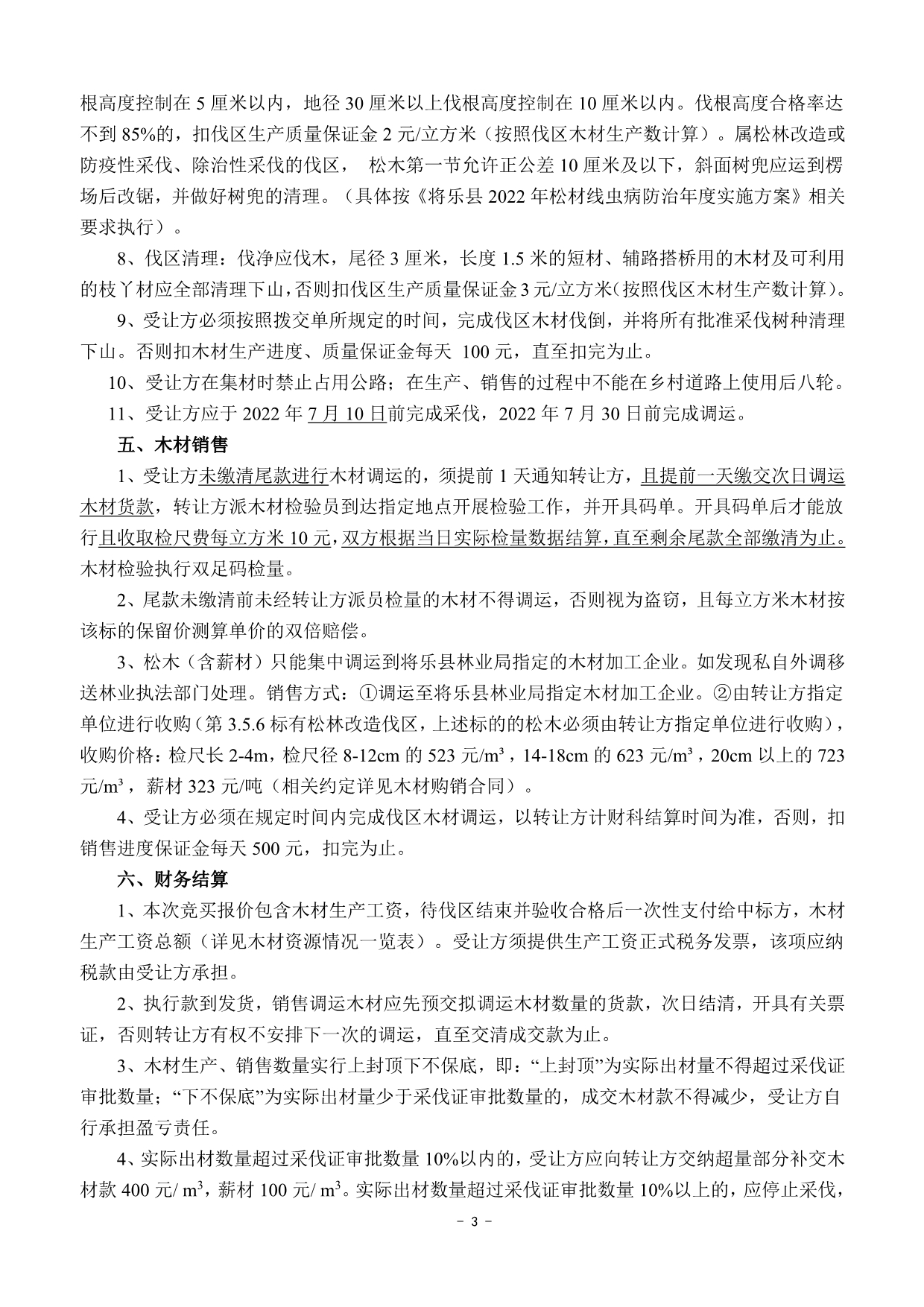 重要信息披露 | 1、標(biāo)的簡介所列的出材量等數(shù)據(jù)僅供參考,標(biāo)的以現(xiàn)狀交付,轉(zhuǎn)讓方及交易中心不承擔(dān)標(biāo)的面積與實(shí)測面積、標(biāo)的出材量與實(shí)際出材量差異等責(zé)任,不調(diào)整相應(yīng)的成交價(jià)格。 2、本次競買報(bào)價(jià)包含木材生產(chǎn)工資,木材生產(chǎn)工資總額詳見木材資源情況一覽表,待伐區(qū)結(jié)束并驗(yàn)收后一次性支付給受讓方。 3、銷售費(fèi)用、成交后發(fā)生的政策變化費(fèi)用、稅收均由受讓方承擔(dān)。 4、松木(含薪材)只能集中調(diào)運(yùn)到將樂縣林業(yè)局指定的木材加工企業(yè)。如發(fā)現(xiàn)私自外調(diào)的,將移送林業(yè)執(zhí)法部門處理。銷售方式:①調(diào)運(yùn)至將樂縣林業(yè)局指定木材加工企業(yè)。②由轉(zhuǎn)讓方指定單位進(jìn)行收購(第3.5.6標(biāo)中有松木改造伐區(qū),上述標(biāo)的的松木必須由轉(zhuǎn)讓方指定單位進(jìn)行收購)(相關(guān)約定詳見木材購銷合同)。 5、受讓方應(yīng)于2022年7月10日前完成采伐,2022年7月30日前完成調(diào)運(yùn)。 6、本次交易第1標(biāo)和第2標(biāo)木材運(yùn)輸需經(jīng)過木材建造的花橋,限載4m,同時(shí),第1標(biāo)伐區(qū)道路開設(shè)需經(jīng)過軍用光纜,道路開設(shè)時(shí)應(yīng)避開。第4標(biāo)寺許村伐區(qū)運(yùn)輸需經(jīng)過高速公路底下涵洞,限高限載6m3,吳厝地村伐區(qū)道路開設(shè)需經(jīng)過電站的水管。一旦參與交易表明意向受讓方已認(rèn)可并接受該風(fēng)險(xiǎn),由該風(fēng)險(xiǎn)產(chǎn)生的一切后果和費(fèi)用由意向受讓方承擔(dān)。 7、未盡事宜詳見木材資源情況一覽表、競買約定、木材生產(chǎn)承包合同(范本)、木材購銷合同(范本)、伐區(qū)位置示意圖等本公告其他附件。 | ||