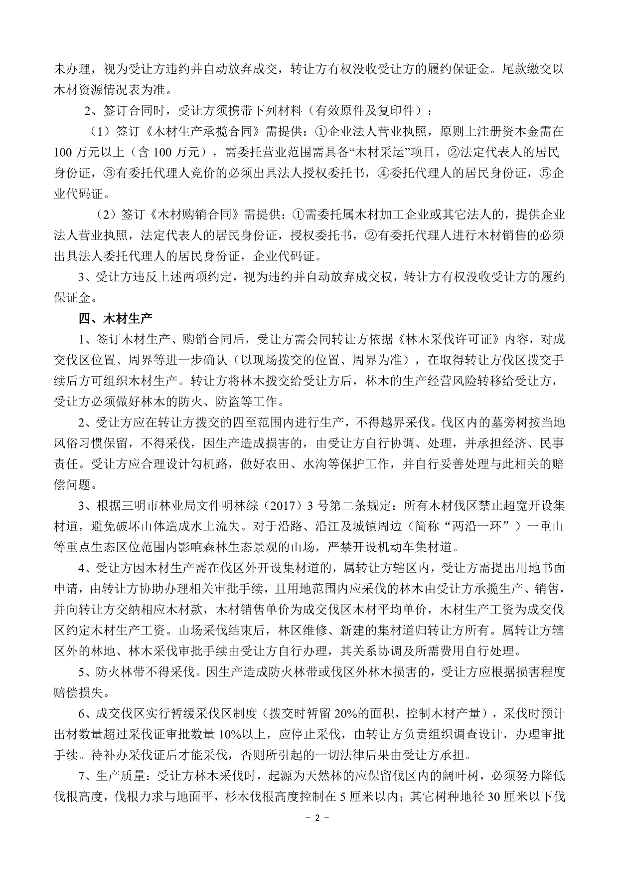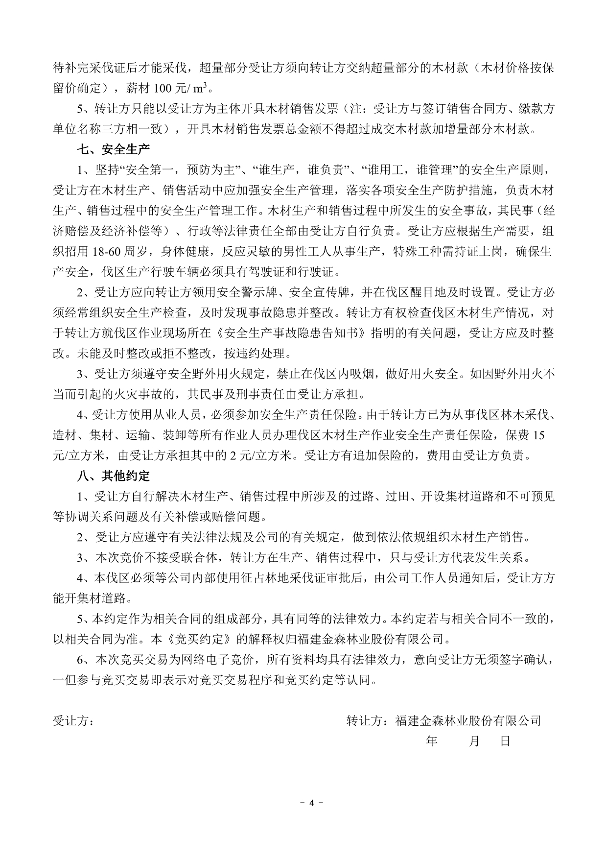 成交確認(rèn)、價(jià)款支付及合同簽訂 | 1 .成交后的兩個(gè)工作日內(nèi)受讓方以微信、郵箱等方式收到《成交通知書》掃描件或電話通知;若受讓方未及時(shí)收到成交通知書的,請主動(dòng)與轉(zhuǎn)讓方聯(lián)系。 2.價(jià)款交納日期及方式:成交后,受讓方須于2022年5月3日17:00前將首期木材款(詳見木材資源情況一覽表)及每標(biāo)生產(chǎn)風(fēng)險(xiǎn)保證金6.5萬元(含木材生產(chǎn)進(jìn)度、質(zhì)量保證金3萬元;銷售進(jìn)度保證金1.5萬元;安全生產(chǎn)保證金2萬元)轉(zhuǎn)入轉(zhuǎn)讓方指定銀行賬戶,并與轉(zhuǎn)讓方簽訂《木材生產(chǎn)承攬合同》和《木材購銷合同》。尾款交付方式以木材資源情況一覽表為準(zhǔn)。 轉(zhuǎn)讓方指定銀行賬戶如下: 戶名:福建金森林業(yè)股份有限公司 開戶銀行:福建將樂成功村鎮(zhèn)銀行股份有限公司 賬號(hào):9031510010010000033058 3.受讓方不依據(jù)本公告的要求履約的,視為自動(dòng)放棄受讓資格,其已交納的交易保證金不予退回,并對交易中心因此造成的損失承擔(dān)賠償責(zé)任,轉(zhuǎn)讓方有權(quán)將該標(biāo)的重新組織競買交易。 | ||